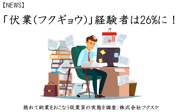 . 副業している従業員の健康管理 本業の会社が行うべき? 8月 27 2020.【NEWS】「伏業」経験者は26に!隠れて副業をおこなう従業員の実態を調査:株式会社フクスケ 人事部から企業成長を応援するメディア from hrnote.jp副業している従業員の健康管理 本業の会社が行うべき? 8月 27 2020.